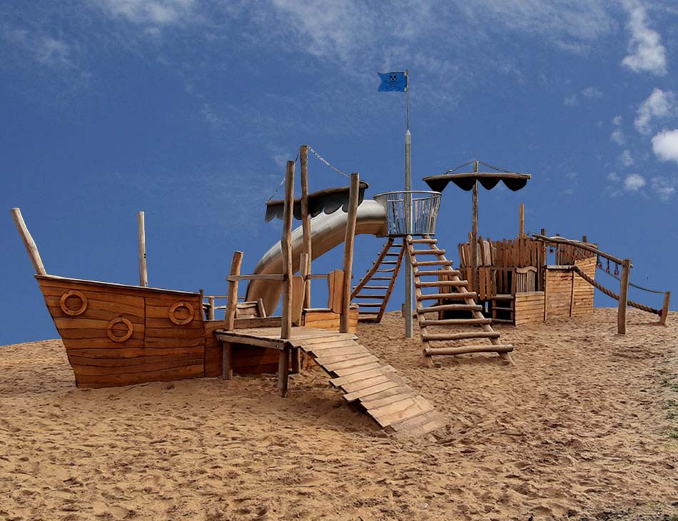 Mittelmast mit Ausguck, Aufstiegsleiter/-netze, Heckteil Podeste in versch. Höhen, unterhalb teilw. geschlossen, Mast mit Segel, Climbingwand, Balanciertau, Hangelstrecke