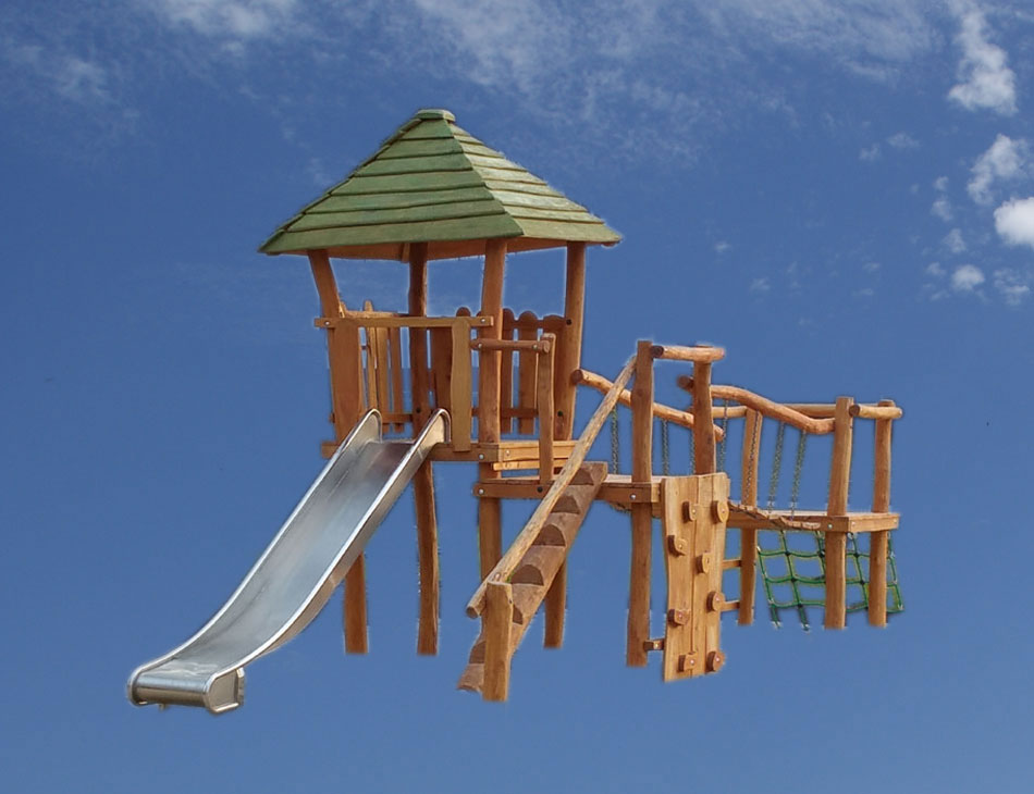 1200x1000x350 Sechseckturm175 mit Reifenaufstieg, Kletterstange, Climbingwand, Stammleiter, Wackelbrücke, Podestturm145 Aufstiegsnetz, Rampe, Balancierbrücke, Podest100 Sprossenleiter, Dreieckspodest75, Schlaufenbrücke, Palisaden, Balancierstamm, Wackelsteg.